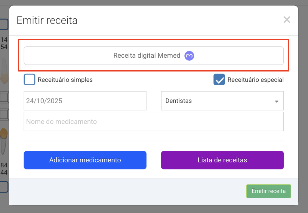 No entanto, ao clicar em Receituário, você também tem a opção de emitir a receita digital pela Memed.