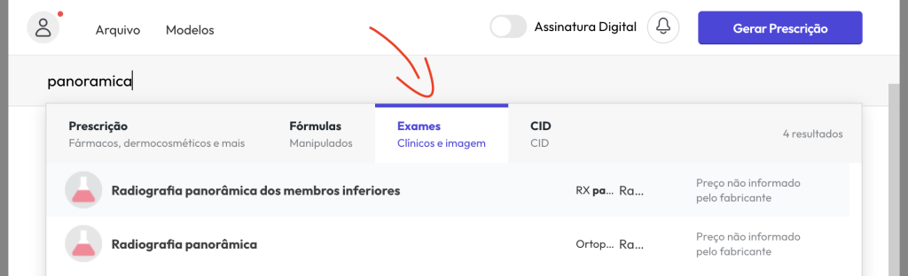 Da mesma forma que você emitiu a receita, é possível emitir pedidos de exame pela integração com a Memed. A única diferença é que você deve selecionar a aba “Exames” dentro da Memed e buscar pelo nome do exame desejado.