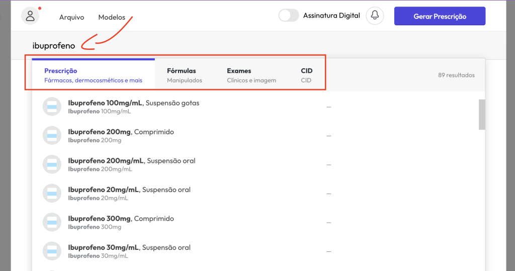 Escolha o medicamento (Ibuprofeno), mantendo a aba “Prescrição” selecionada.